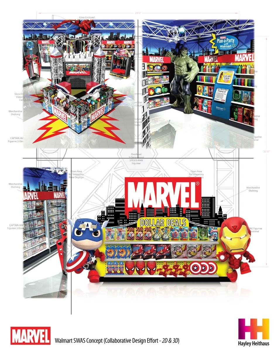 I worked with 2 other designers to make this 2D/3D project come alive visually. Walmart had asked us to put together a look that would showcase an actual store they would have within a Texas Walmart. I was given access to Marvel’s characters, and came up with some really fun graphics to show in these final 3D rendering views, as well as lots of 3D modeling.
